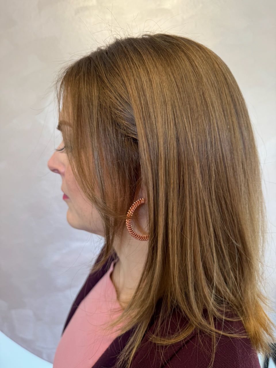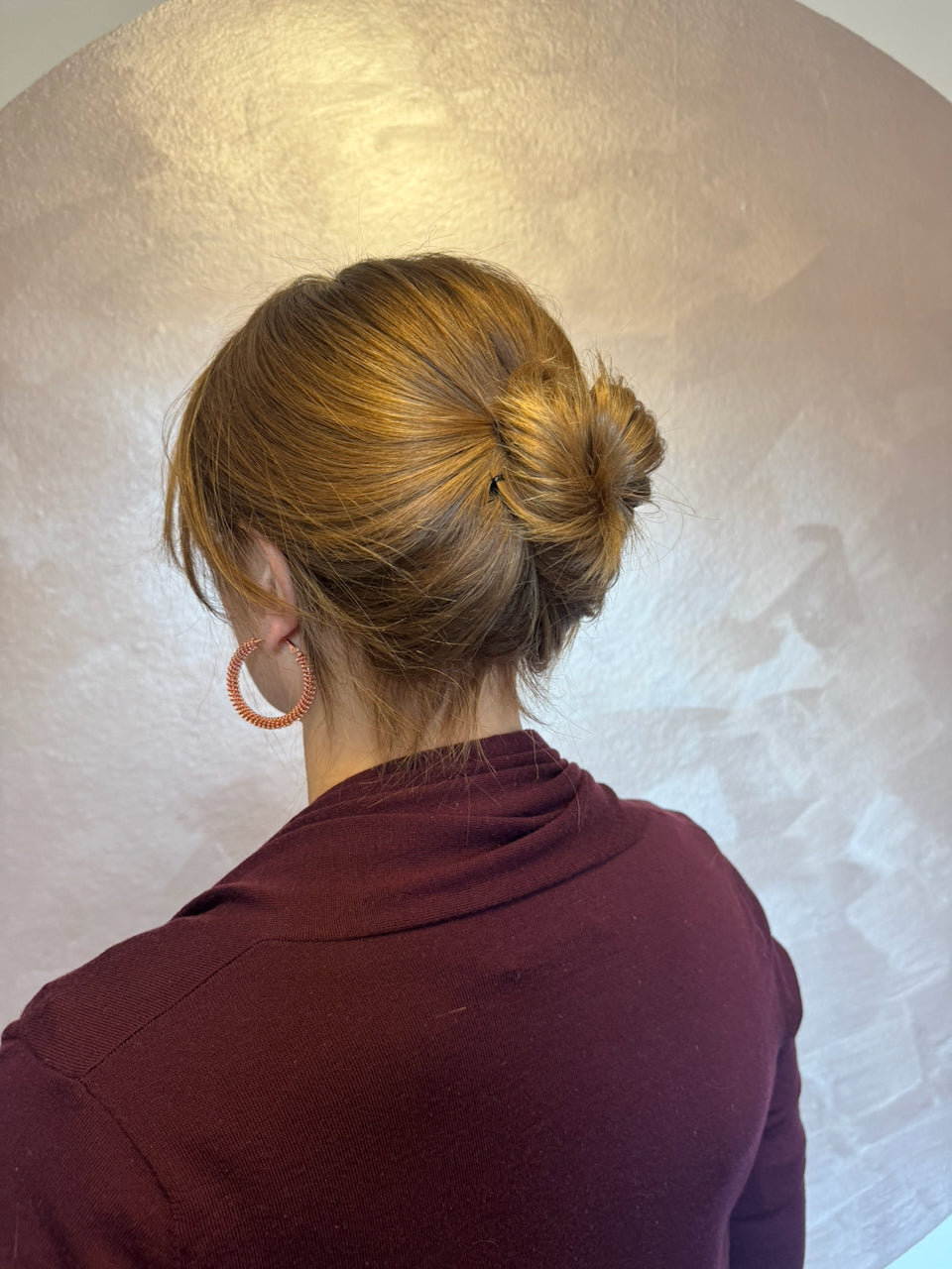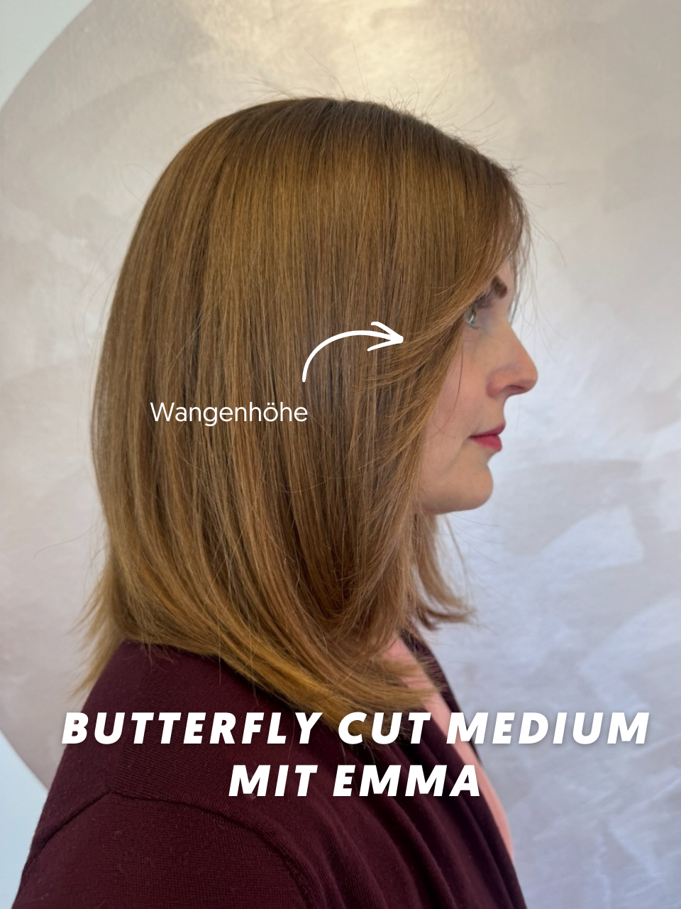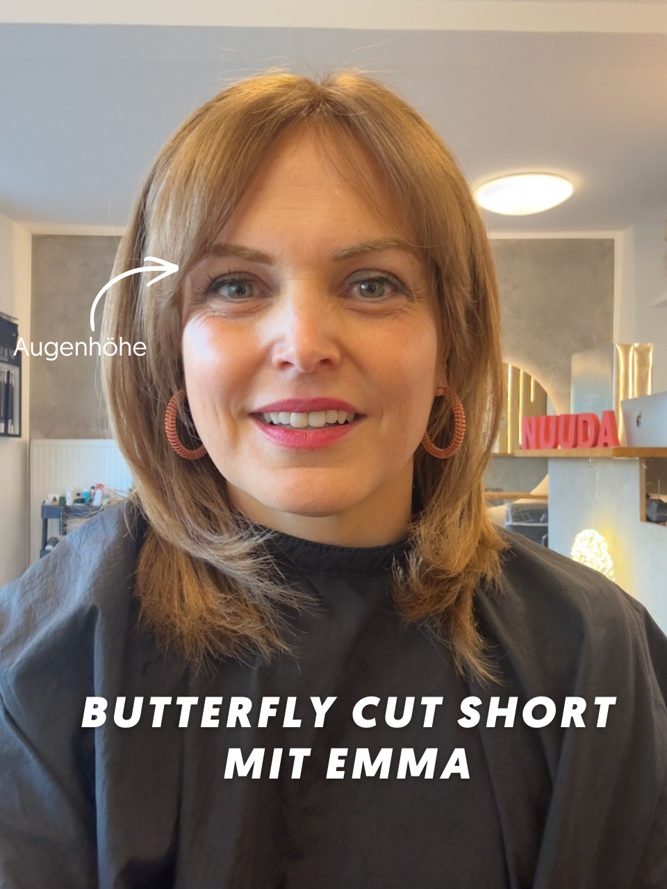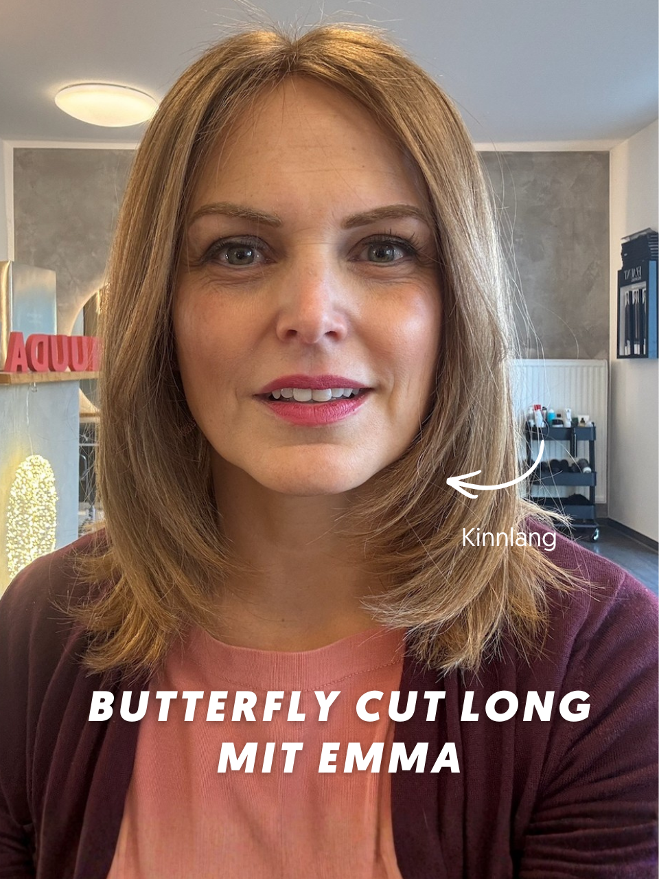 Dann ist unsere Emma mit gesichtsumrahmendem Butterfly Cut genau das Richtige für Dich. Denn das ist unser vielerprobter NUUDA Signature Cut.